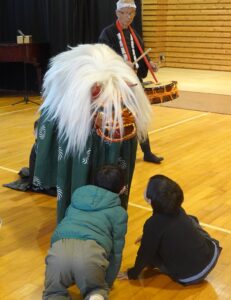 相模里神楽垣澤社中の方々が来てくださり、郷土芸能について教えてくださいました。「御祝儀三舞」というお祝いの席で披露される獅子舞を披露してくださいました。
