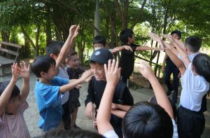 始業式の後には、新しいグループで協力して「カムオン!」というゲームをしました。新しいグループともすぐに打ち解けることができていました。