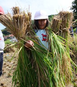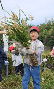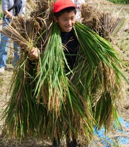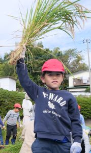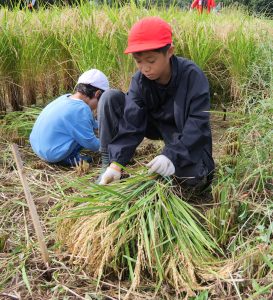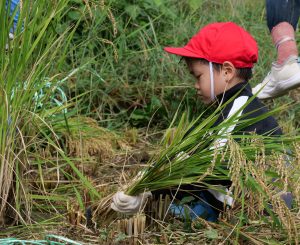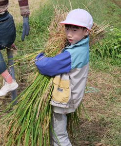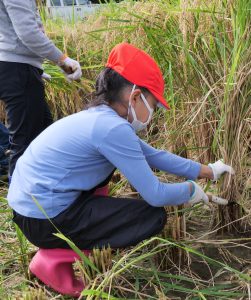児童が刈り始めの時には、感覚がつかめず1束刈るのに時間がかかっていました。そのうちコツが掴めたようでサクサクと刈っていき、テンポよく終わらせていました。ひとり一人が周りと協力して自分にできることを探して行動している姿はとても格好良かったです。この調子で、次の脱穀でも素敵な姿を見せてほしいと思います。