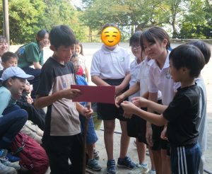 最後にすべてのスタンプを集め終わると、1年生は在校生の手作りのメダルを校長先生からかけてもらいました。