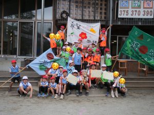 今年の年間テーマ「文化」にちなんで、歌は日本で昔から子供たちにうたわれてきた「ずいずいずっころばし」を披露しました。また、お神輿は世界の文化を象徴する遺跡や建造物、食べ物などを地球を取り囲むように配置したお神輿を作り、音楽隊とともに元気よくみんなで担いで会場を練り歩きました。