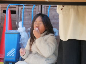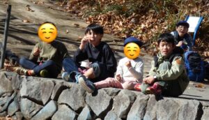 焼き芋では、芋を新聞紙とアルミホイルで隙間なく包んで中身が見えないか確認しながら熾火のそばに置きました。児童のおかげで少し焦げてしまったもんもありましたが、ほくほくで甘い美味しい焼き芋ができました。