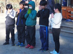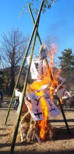 どんど焼きでは、炎が上がると児童皆が願い事を一生懸命していました。また、自分たちの書初めが燃えて天高く上った時には歓声を上げて喜んでいました。