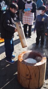 餅つきでは、最初に6年生が下級生に応援してもらいながら餅つきをしました。その後グループごとに餅つきと昔遊びをして日本の文化を感じることが出来ました。