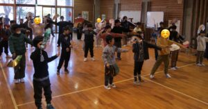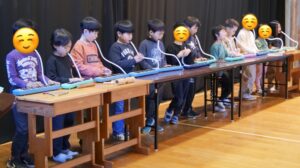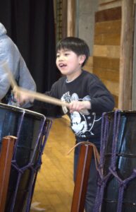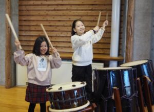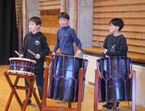その後、グループごとに分かれて実際に太鼓を叩いて一曲演奏することが出来ました。とても真剣に話を聞いてみんなで音をそろえながら楽しむ姿がみられました。