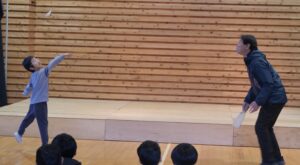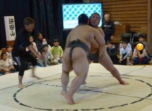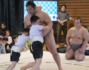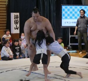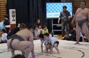 今年のどすこい大相撲七沢場所では、浜田山と若肥前の2名の力士が来てくださいました。間近で見る力士同士の対戦に児童たちは目を輝かせながら見ていました。その後、実際に児童2名と力士1名で対戦をしました。対戦した児童たちは独自の四股名をそれぞれつけ、作戦を立てて挑んでいました。