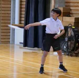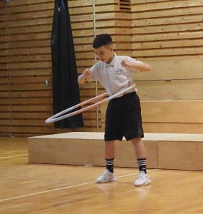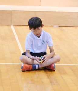 フリスビーの連続パス、こまを板の上と手の上に交互に乗せてまわす技、フラフープの連続記録への挑戦、ルービックキューブの6面揃えなど、どれもなかなか高度な技で、みんなが見ている中でとても緊張したことと思いますが、集中して成功させることが出来ていました。
