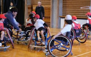 実際に競技用の車椅子の乗り方の練習をしてから試合を行いました。車椅子でまっすぐ進むには左右のタイヤを回す力を同じにしなければならず、頭で分かっていても実際にやることが難しく斜めに移動してしまって児童同士でぶつかり合っていました。試合では、ボールをドリブルさせながら車椅子で進むことができずボールを抱え込んで守っている姿がありました。