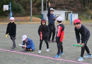 低学年はティーボールを、高学年はサッカーをしました。最後にはグループごとにリレーをしました。