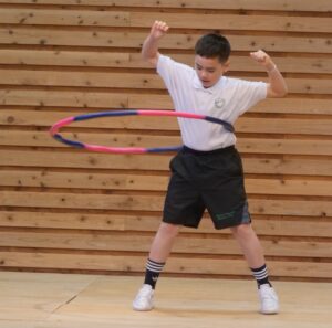 今月の十八番朝会ではフラフープの発表と独楽の発表をしてくれました。フラフープの披露をしている児童は昨年度から何度か挑戦しており、発表ごとに継続回数を増やして上達している姿にみんな大きな拍手を送っていました。