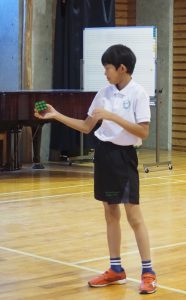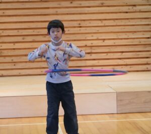 今月は4組の児童がフリスビー、こま、フラフープ、ルービックキューブの発表をしてくれました。